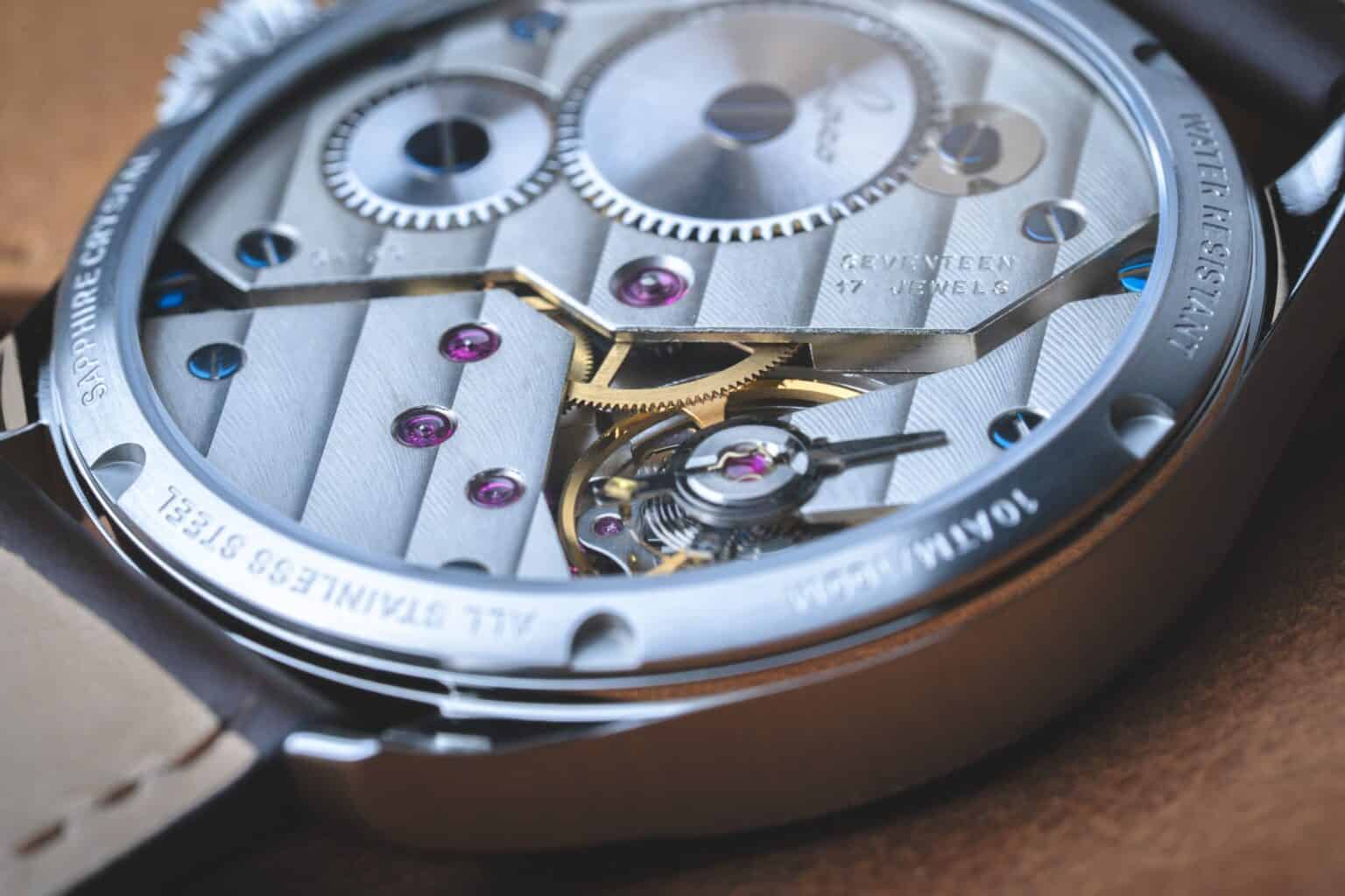 Die Zeiger der “Würzburg” werden in der klassischen 42,5 Millimeter-Version durch das bewährte UNITAS ETA 6498.2, einem legendären Kaliber der Uhrmacherkunst, angetrieben. Einst häufig in Taschenuhren verwendet, findet man dieses besondere Handaufzugswerk heute nur noch selten. In der etwas kleineren Midsize-Variante arbeitet das kompakte Schweizer Kaliber Sellita SW261. Beide Uhrwerke präsentieren sich durch den großen Saphirglasboden und zeigen traditionelle Veredelungen wie Zierschliffe und thermisch gebläute Schrauben.