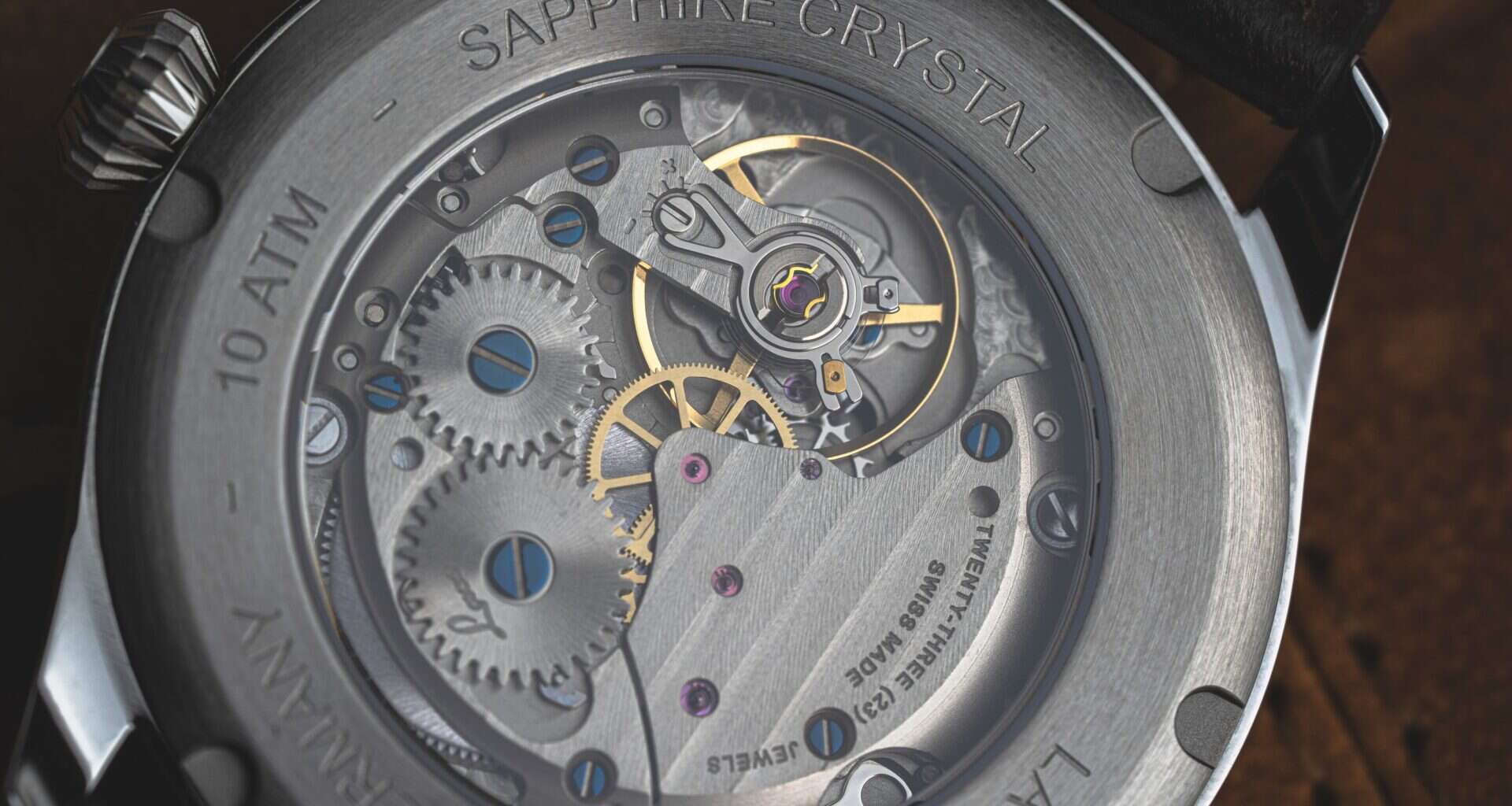 In the classic 42.5 millimeter version, the hands of the “Ulm” are driven by the tried-and-tested UNITAS ETA 6498.2, a legendary watchmaking caliber. Once frequently used in pocket watches, this special hand-wound movement is rarely found today. The slightly smaller midsize version is powered by the compact Swiss Sellita SW261 caliber. Both movements are presented through the large sapphire crystal case back and feature traditional finishes such as decorative cuts and thermally blued screws.